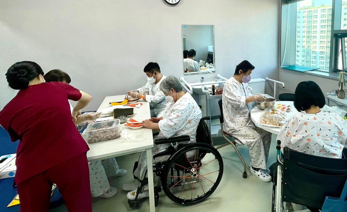 일상생활 훈련은 식사하기, 옷 입고 벗기, 이동훈련, 목욕하기, 개인위생 등의 훈련을 합니다. 환자들이 병원 안에서 해야 하는 일상생활활동과 퇴원 후 가정생활 및 지역사회복귀에 필요한 각 훈련들을 환자 단계에 따라 1:1맞춤으로 적절한 훈련 계획을 수립하여 시행합니다.