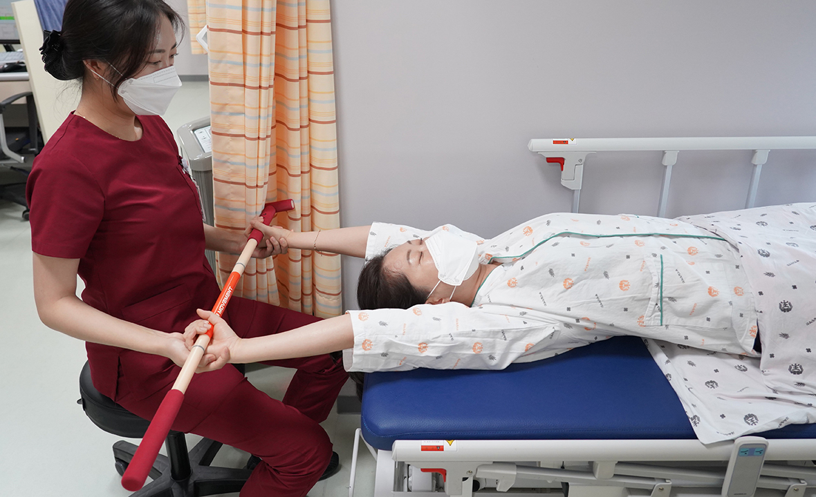 - 오십견, 회전근개질환 등 어깨통증으로 인해 움직이기 힘들 때, 건강한 팔로 막대를 움직이며 통증이 있는 팔의 어깨 관절 가동범위의 증가와 통증 감소를 위한 어깨 재활 운동입니다.